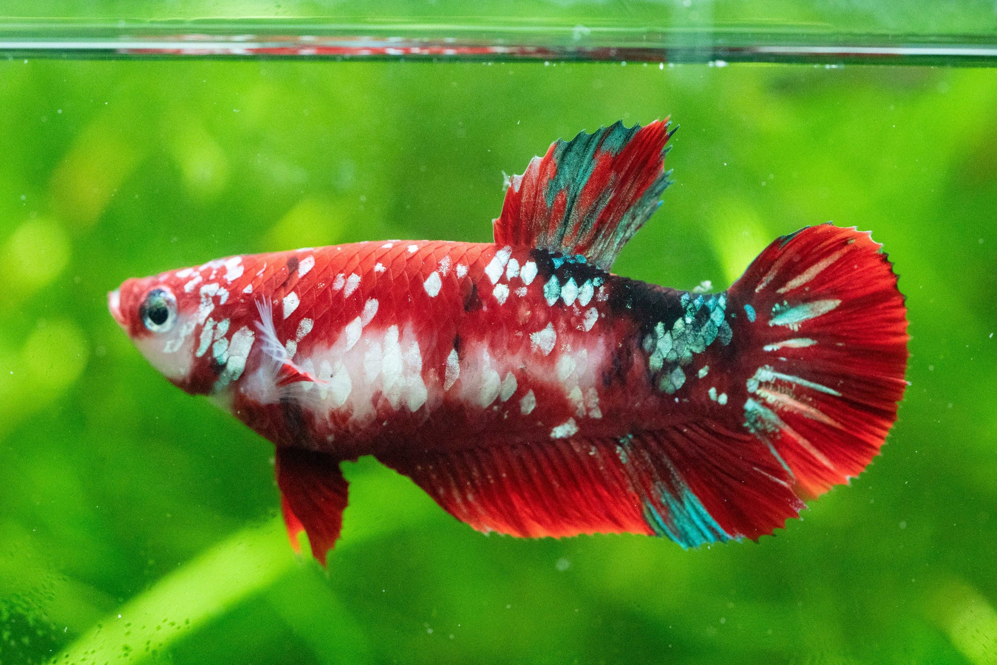 Elevate your aquarium with the striking beauty of the Female Betta Fish Sorority Koi Red Galaxy Plakat. These breathtaking bettas feature a vibrant red base with splashes of black, blue, and white, resembling a dazzling galaxy. Known for their koi-like patterns and bold, intense colors, these bettas are a captivating addition to any sorority tank. Their plakat (short tail) enhances their active swimming style, making them a lively and engaging focal point in your aquatic setup.